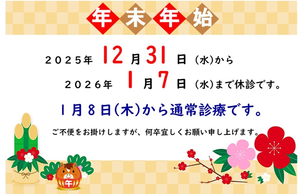2025年末2026年始休みのお知らせ 2025 10/01 2025年12月31日(水)〜2026年1月7日(水)まで休診させていただきます。 1月8日(木)から通常診療を行います。ご不便をお掛けしますが、何卒宜しくお願い申し上げます。 お知らせ 休診日 8月お盆休みのお知らせ 関連記事 8月お盆休みのお知らせ 2025年5月30日 WEB予約が始まりました 2025年5月12日 副院長就任のお知らせ 2025年4月1日 WEBの不具合 2025年3月13日 ゴールデンウイークの休診 2025年3月6日 代診のお知らせ 2024年10月31日 年末年始の休診日 2024年10月3日 2024年7月の医師勤務表を更新しました 2024年7月5日